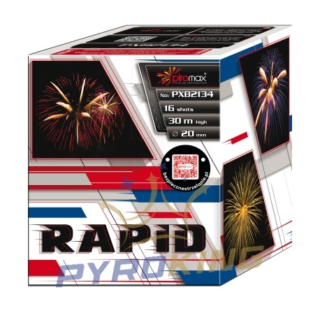 RAPID PXB2134 to kompaktowa wyrzutnia fajerwerków klasy F2 od polskiego producenta Piromax. Urządzenie zapewnia widowiskowy pokaz z różnorodnymi efektami świetlnymi, takimi jak czerwone i błękitne gwiazdy ze złotym deszczem czasu, złote palmy zakończone złotym migotaniem oraz brokatowe korony przechodzące w czerwone i zielone migotanie. Dzięki prostemu układowi strzelania i niewielkim rozmiarom, RAPID PXB2134 jest idealna na domowe imprezy, Sylwestra czy inne okazje wymagające efektownego zakończenia.