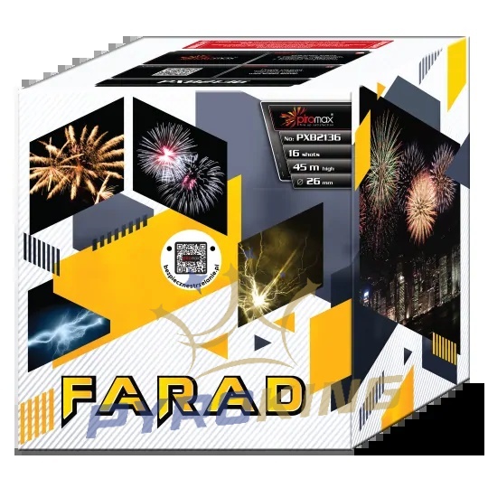 Farad PXB2136 to 16-strzałowa wyrzutnia fajerwerków klasy F2 o kalibrze 26 mm, oferująca intensywne efekty wizualne jak fioletowy kokos, zielone migotanie i trzeszcząca wierzba.