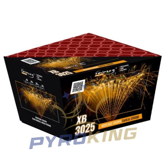 XB3025 BROCADE CROWN DALHIA STROBE od renomowanego producenta Triplex to wyrzutnia klasy F3, oferująca 49 efektownych strzałów o kalibrze 30 mm. Dzięki kątowemu układowi strzałów i starannie dobranym efektom, tworzy widowisko idealne na finał dużych imprez plenerowych, pokazów miejskich i sylwestrowych gal.